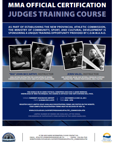 Today the BC Government issued a press release announcing a COMMAND training course being set up in BC with a view towards the eventual certification of MMA judges under the Athletic Commissioner Act.
