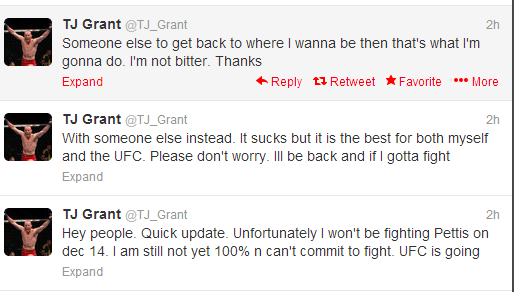 A second title shot was set up against newly minted champion Anthony Pettis. Unfortunately, as sometimes happens with concussive injury, Grant’s symptoms were prolonged and slow to recover. Tonight he announced on twitter that he will need to step down from this second opportunity with the following updates:
