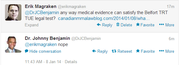 To follow the letter of the law the NSAC must be presented with evidence that the cause of Belfort’s TRT needs is not even “in part” related to his previous anabolic steroid use. Given that a known consequence of anabolic steroid use includes decreased testosterone production it will be an uphill battle for the NSAC to justify a TUE in Belfort’s circumstances. Unless a doctor can provide persuasive medical evidence explaining the cause of Belfort’s low testosterone production and further ruling out the previous 4-hydroxytestosterone use a TUE cannot be granted under WADA standards.