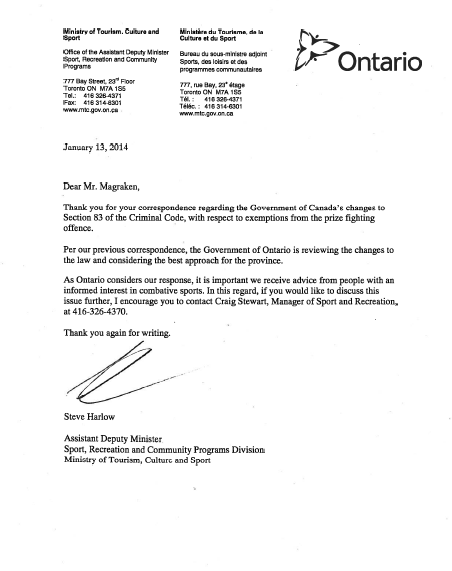 The Ministry is seeking feedback from the combat sports industry and advises that “it is important we receive advice from people with an informed interest in combative sports. In this regard, if you would like to discuss this issue further, I encourage you to contact Craig Stewart, Manager of Sport and Recreation, at 416-326-4370”