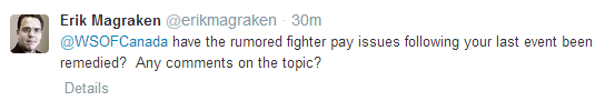 It is rumored that, following WSOF Canada’s Ford v. Powell card, fighter pay issues arose with some cheques issued being cancelled or otherwise not clearing. I reached out to WSOF Canada to verify these rumours but at the time of publication they have yet to respond:
