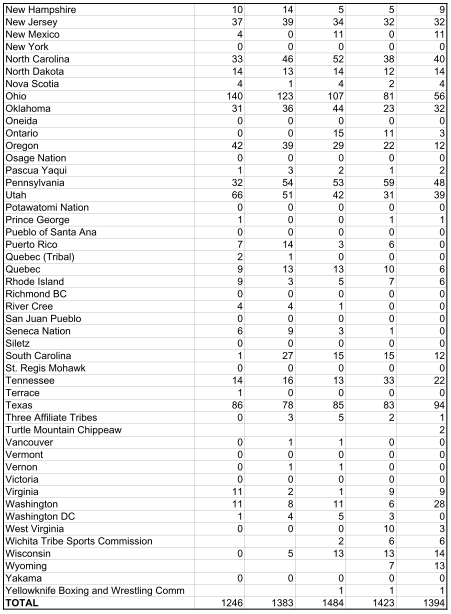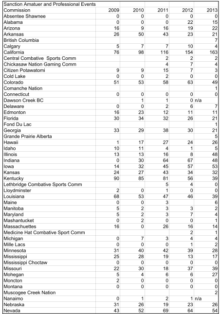 Included in the 2014 Association of Boxing Commission Annual Conference Documents were lists setting out the volume of sanctioned amateur and professional events by various State, Tribal, Provincial and Municipal Athletic Commissions in the US and Canada.