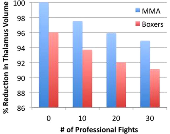 In today’s study (Repeated head trauma is associated with smaller thalamic volumes and slower processing speed) published at the British Journal of Sports Medicine, 224 fighters (131 mixed martial arts fighters and 93 boxers) were recruited along with 22 controls. Each participant underwent computerised cognitive testing and volumetric brain MRI. The results were that “Increasing exposure to repetitive head trauma measured by number of professional fights, years of fighting, or a Fight Exposure Score (FES) was associated with lower brain volumes, particularly the thalamus and caudate. In addition, speed of processing decreased with decreased thalamic volumes and with increasing fight exposure”