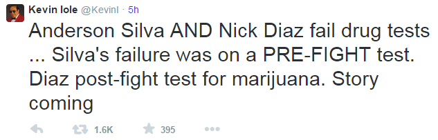Earlier today Kevin Iole broke the news that both UFC 183 headliners failed drug tests. Nick Diaz failed a post fight drug test for marijuana. Perhaps more newsworthy, Anderson Silva failed an out of competition test taken some three weeks prior to the event testing positive “for two anabolic steroids, drostanolone and androstane“.