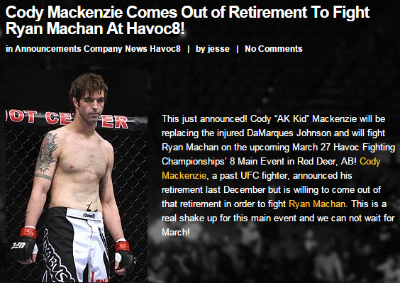 In an interesting development, former UFC Fighter Cody McKenzie is scheduled to headline Havoc FC 8 which takes place on March 27, 2015 in Red Deer Alberta. Here is the promotions advertisement of the bout –
