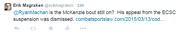 McKenzie is currently serving a 3 month suspension levied by the Edmonton Combative Sports Commission following an intentional headbutt disqualification loss at WSOF 18 which took place on February 12, 2015. Earlier this month McKenzie’s appeal of this suspension was dismissed by the ECSC. The Havoc FC8 date is squarely in the middle of this suspension. McKenzie could judicially review the suspension as it is arguably on shaky statutory ground but any such review likely could not be completed before the upcoming HavocFC fight card.