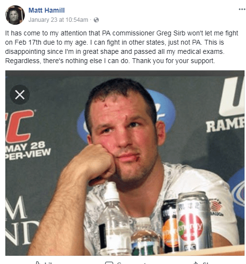 In a Facebook post published earlier this week former UFC fighter Matt Hamill suggests that the Pennsylvania State Athletic Commission has denied him licencing due to age.