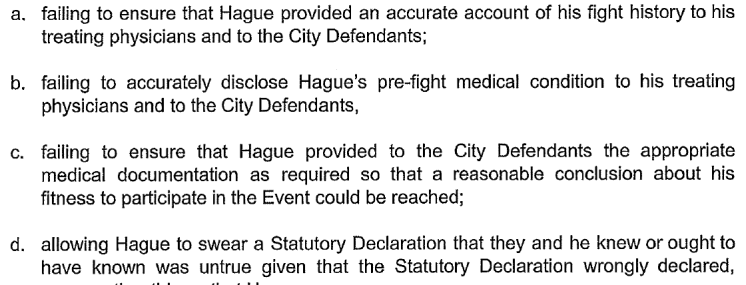 These are novel allegations. The City hopes to escape blame but if they are liable they hope to spread some of the fault to these individuals close to Hague. These allegations have not been proven in Court but raise novel questions about what legal duty, if any, a fighters trainers have in allowing them to compete. Ultimately a regulator has the mandated authority to make health and safety decisions and passing blame will not be an easy task. Many of these allegations against the trainers are the mandated duties of regulators. Time will tell if this latest strategy has any merit. Among the City’s accusations of trainer negligence are the following: