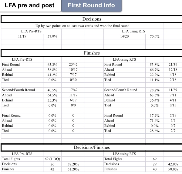 The recent data looked at fights promoted by the Legacy Fight Alliance (the “LFA”). Ten cards from Texas, Minnesota and South Dakota were reviewed without open scoring. The results were contrasted with nine subsequent cards from Kansas where open scoring was utilized. The data revealed that the fighter who was up by two points by at lest two cards without open scoring went on to win the final round 57.9% of the time. On the other hand fighters up by two points on at least two cards went on to win the final round 70% of the time with open scoring. Also noteworthy that the fighter that won the first round also won the second round 69% of the time without open scoring. With open scoring, they also won the second round 77.8% of the time.