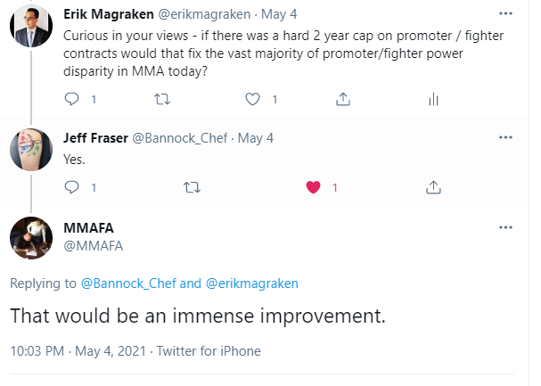 A hard cap on contract lengths is an easy concept for everyone to understand. This reform would create regular free agency. This would allow fighters to frequently have their value tested. This would allow current promoters to go after top talent. This would allow new promoters to easily enter the game. This would create bidding wars. It would create competition. It would make fighter pay skyrocket. And its not complicated.