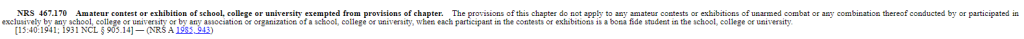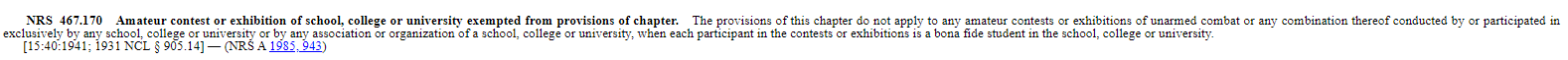 Nevada, like a lot of jurisdictions, has a regulatory exemption for University held combative sports. This is so collegiate and intercollegiate competitions can occur in a largely self governed manner. Specifically NRS 467.170 reads as follows: