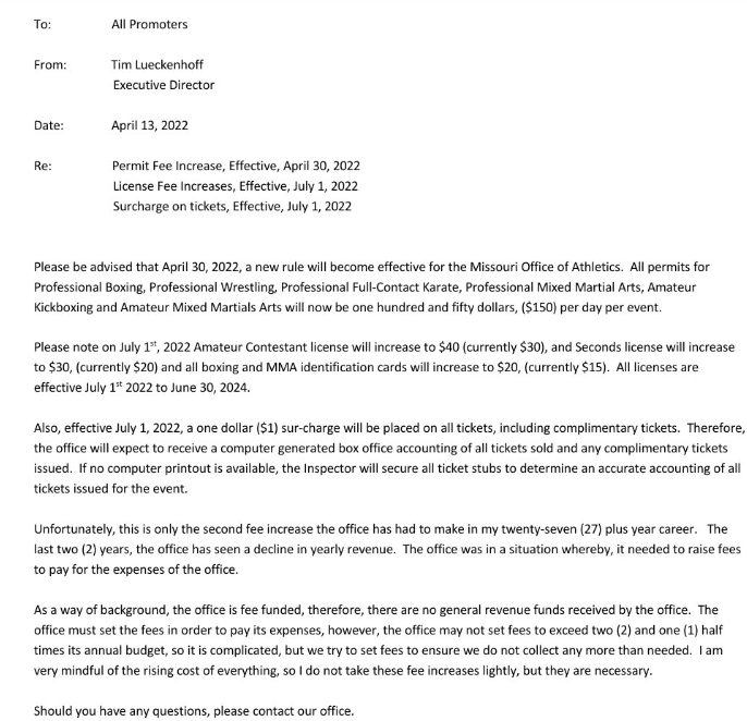Missouri Office of Athletics Executive Director Tim Lueckenhoff recently circulated a memo notifying industry stakeholders of increased fees for combat sports events (HT to Carla Duran and Journey Pro KC).