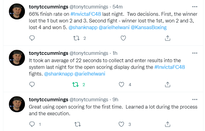 Many critics of open scoring say fighters knowing the score will lead the winning fighter to avoid action and coast to victory in the final round. To date data collected by Kansas does not bear out this concern. The Director of Colorado Combative Sports Commission was quick to tweet out their experience with open scoring and it mirrored the data from Kansas with fighters not coasting to victory and the additional step of publishing data live to fighters did not bog down the flow of the event.
