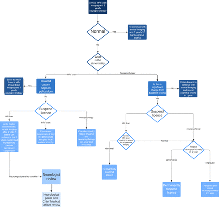 Introduction Repeated head injury is unequivocally associated with brain damage, and an increased risk of Chronic Traumatic Encephalopathy (CTE) dementia. From 1928 until 2005 CTE was a diagnosis exclusively associated with pugilism but is now postulated to be associated with other sports such as rugby and football. For over twenty years the British Boxing Board of Control (BBBoC) has run a neurological screening programme. There are approximately 1000 licenced boxers who undergo a MRI cerebral angiogram on initially licencing with a MRI brain which is repeated annually. This was devised to screen for abnormalities, such as arterio-venous malformations which might predispose to catastrophic bleeding following occupational trauma. A ‘neuro panel’ consisting of one neurologist and three neurosurgeons, was setup to manage abnormal scan findings.