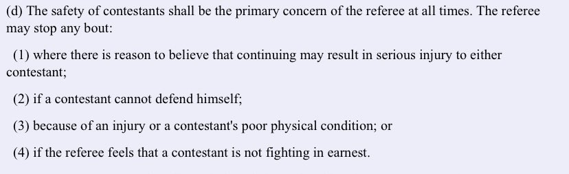Texas regulations tell the referee to keep contest safety as the “primary concern” and to stop a bout in the below 4 circumstances