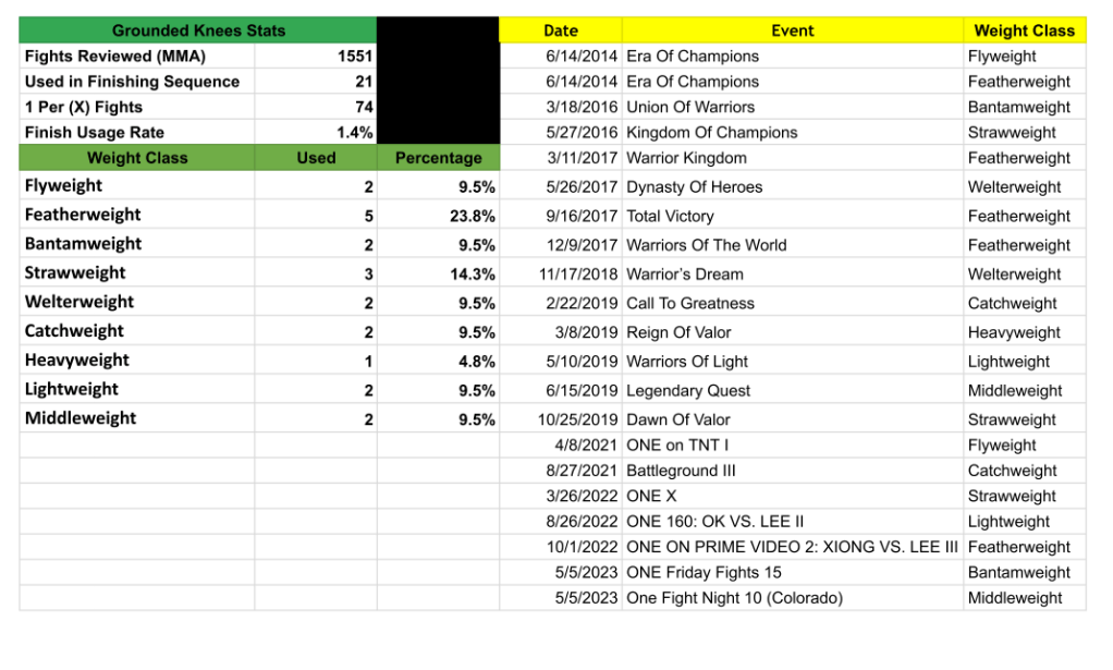 Another interesting bit of information that Colorado compiled was data about knees to the head of grounded fighters. This is relevant because the State recently oversaw an event promoted by ONE Championship whose ‘global’ rules allow these strikes. Colorado’s Director reviewed 1,551 bouts under the ruleset and noted the striked is used in the finishing sequence of only 1.4% of bouts where it is allowed. It is reasonably distributed among weight classes but used more commonly among the lower weight classes and the lease by heavyweights.