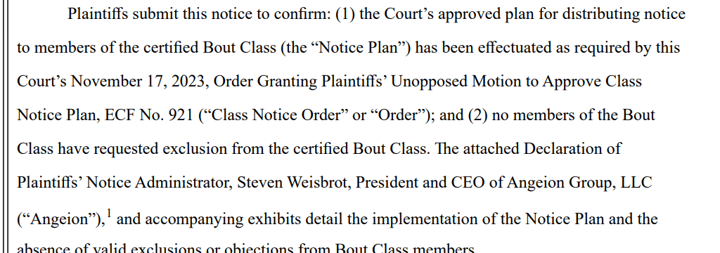 Once certified a court approved plan was created to notify all these fighters and give them a chance to opt out, meaning to remove themselves from the lawsuit.