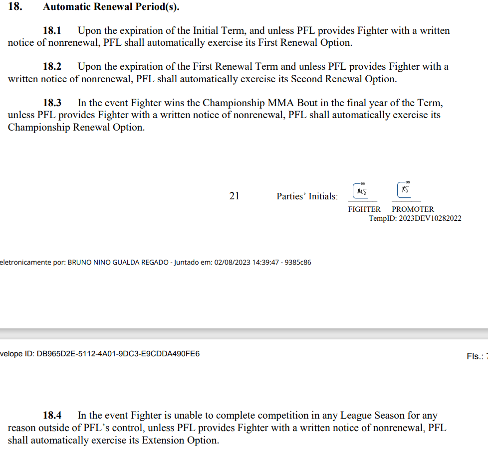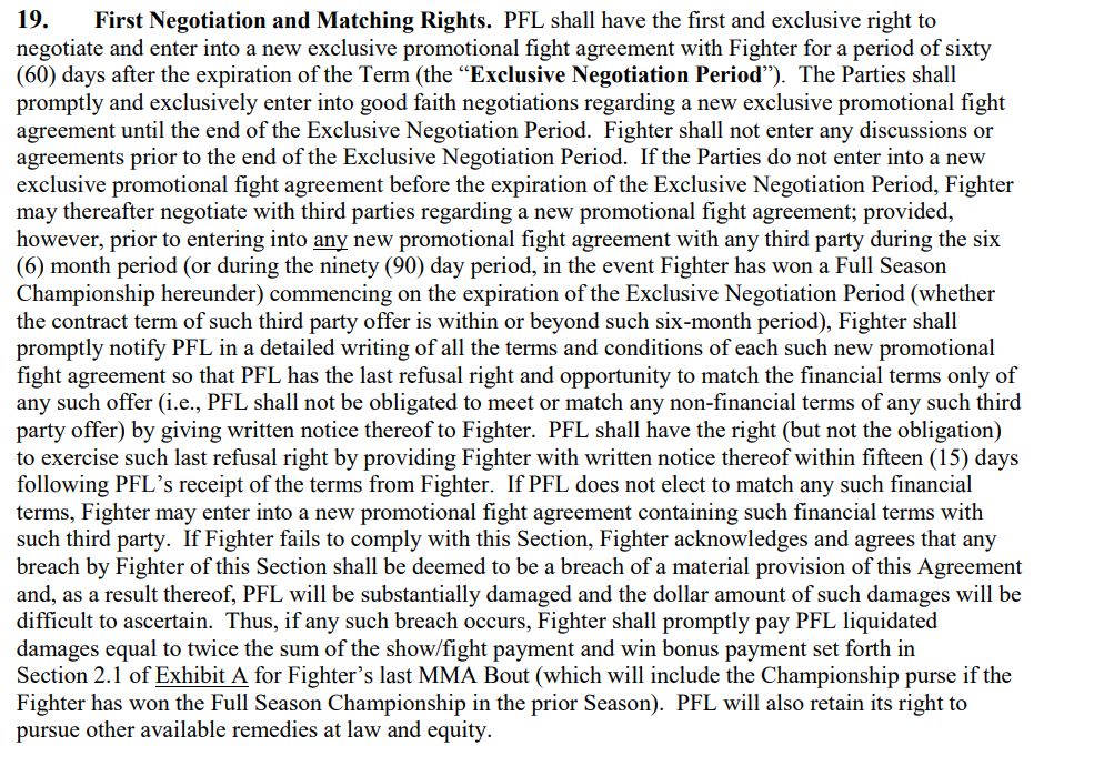 Litigation has probably been the best tool to shed light on contract terms of various MMA promotions. Recently a PFL contract made its way into the public sphere as a result of this (HT to Elthon Costa for first breaking this news).