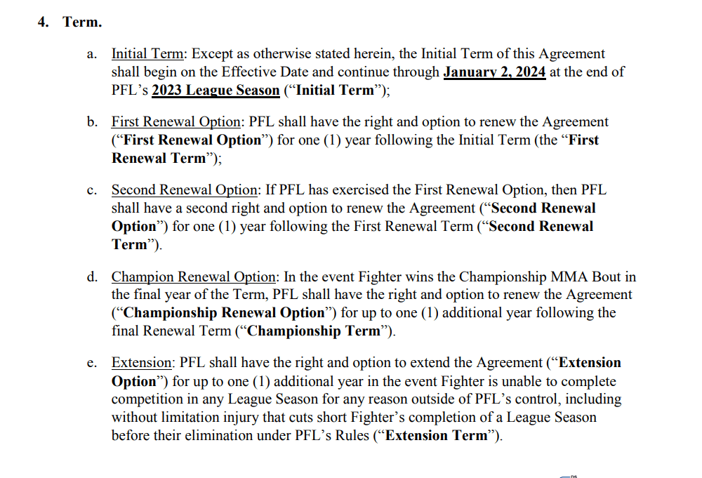 While the initial term is for a single season the PFL can extend it. Then again. Then again if the fighter is the champion.