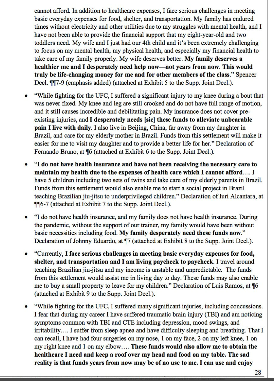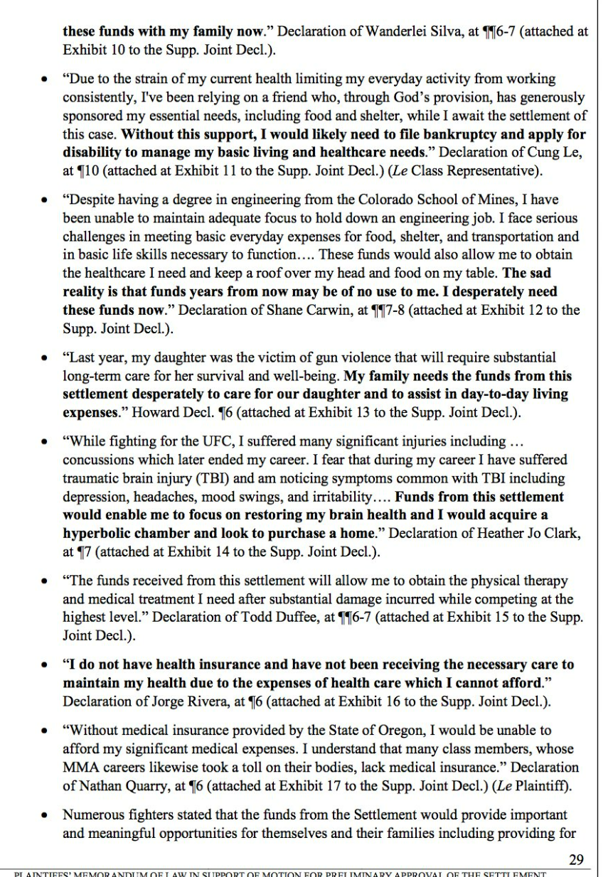 The declarations, beyond supporting the settlement, tell a very sobering story. Many fighters have been left broke and broken. This summary from the court filing (HT John Nash), speaks for itself and is worth a quick read to face hard facts about the aftermath of a career in fighting at the highest levels.