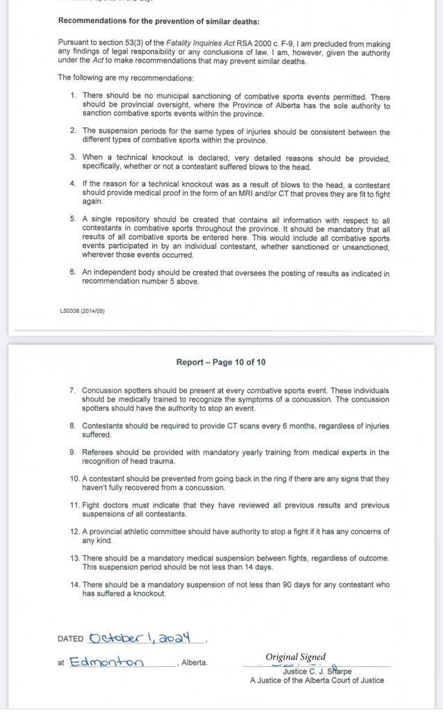 A provincial judge led an inquiry into the death of Hague. This week Justice Carrie Sharpe released her findings and made 14 recommendations for the better oversight of combat sports in Alberta. First and foremost Justice Sharpe said city commissions should be scrapped and a Province wide model should be used. Below are Justice Sharpe’s recommendations.